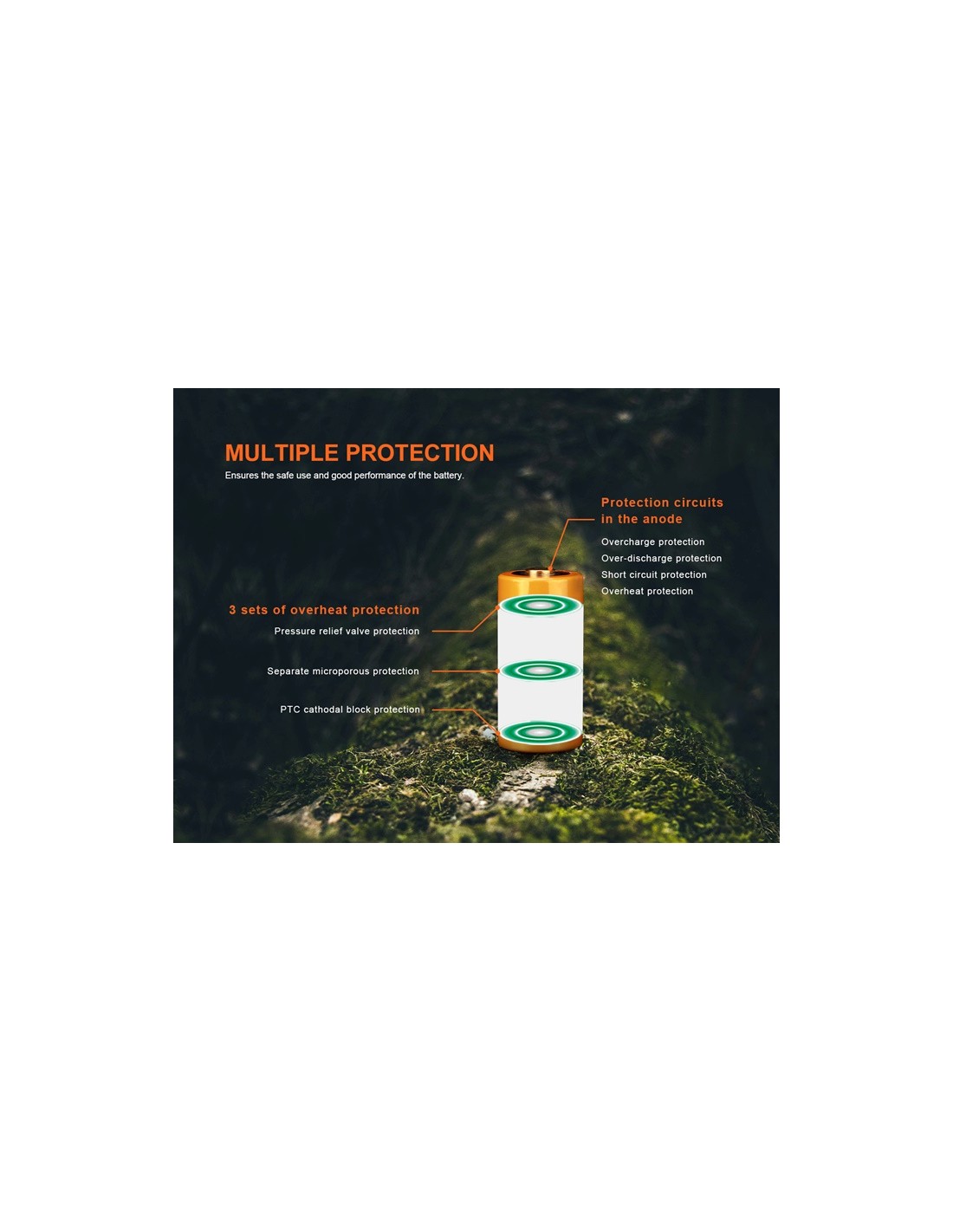 Tiene una capacidad de 1100 mAh y cuenta con múltiples capas de protección, incluyendo circuitos de protección contra sobrecarga y sobredescarga, cortocircuito y sobrecalentamiento en el ánodo, además de una válvula de alivio de presión, protección microporosa y protección de bloqueo catódico PTC. Tiene una corriente máxima de 7 A y es a prueba de fugas y explosiones, fabricada con tecnología de remachado de carcasa de acero.