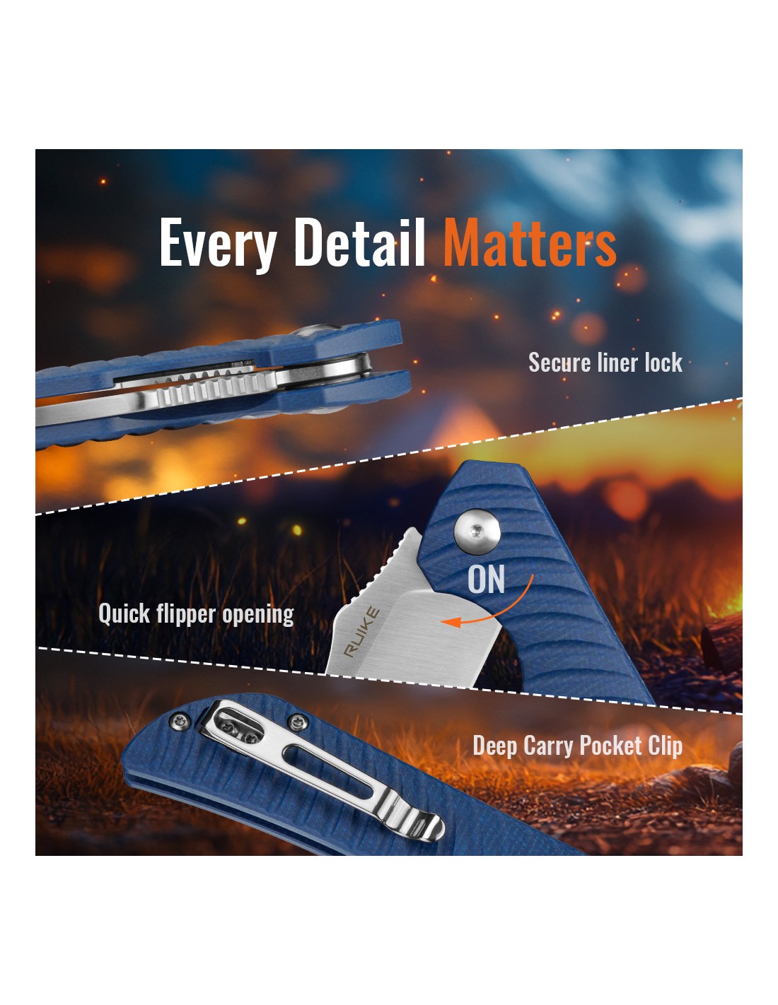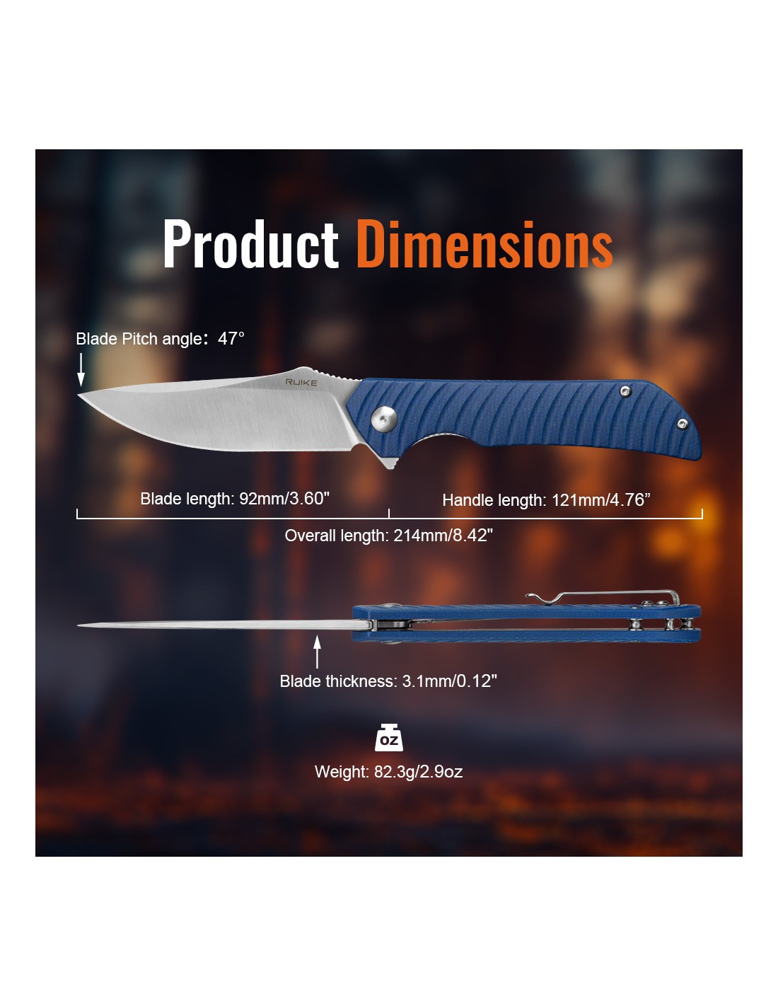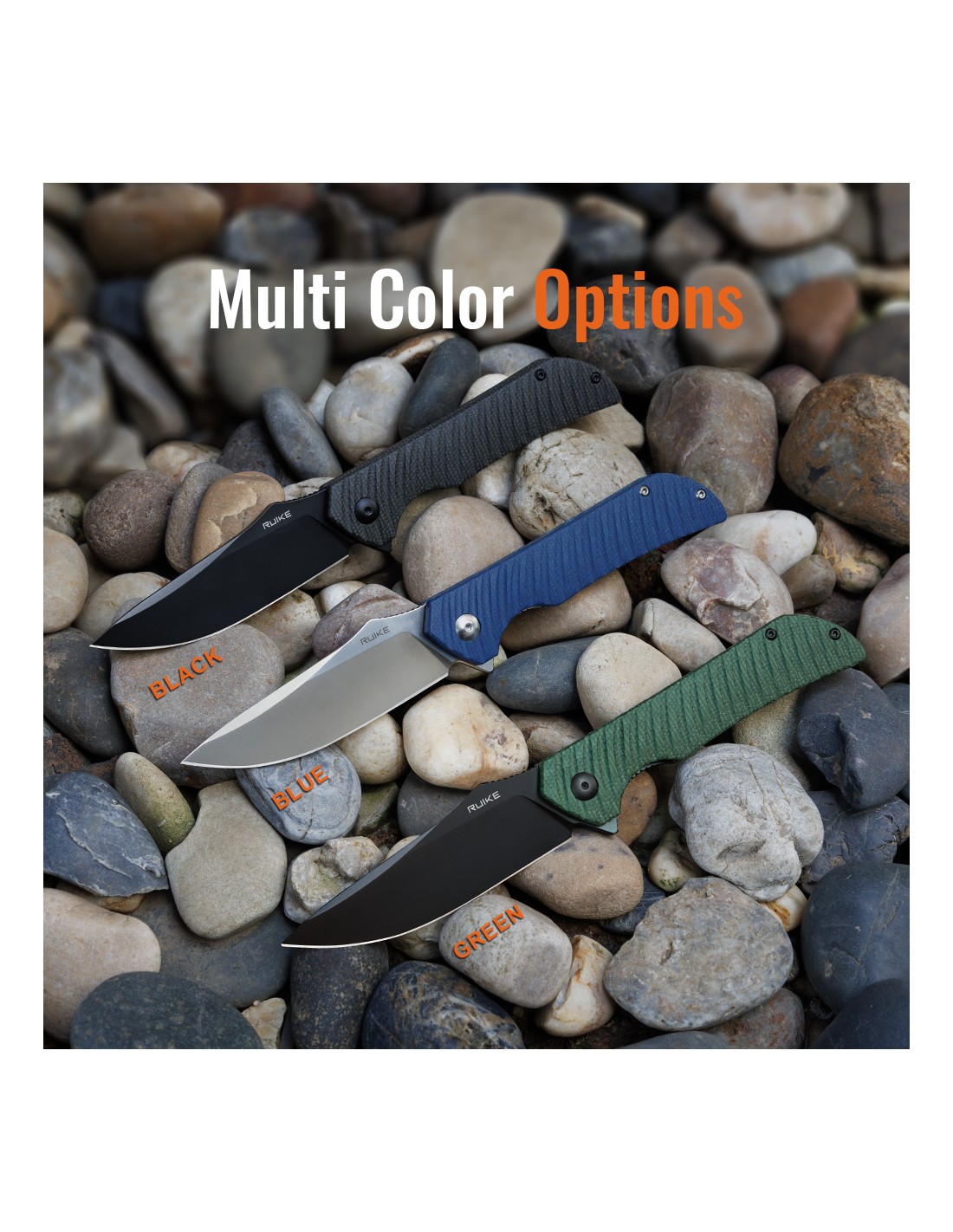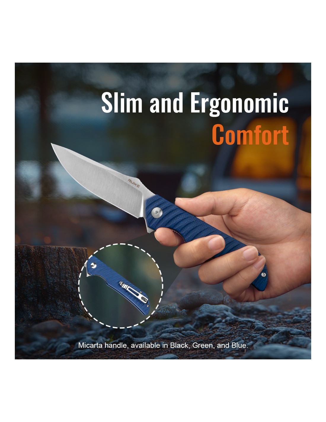 La nueva Ruike P123 en color azul, hace parte de la serie Ruike P123 que está diseñada para ofrecer potencia y precisión, con una hoja Drop Point 14C28N más ancha y recta que destaca en tareas de corte y perforación de alta resistencia. Su punta afilada y direct,a y su robusto mango de Micarta la convierten en la herramienta ideal para trabajos exigentes.