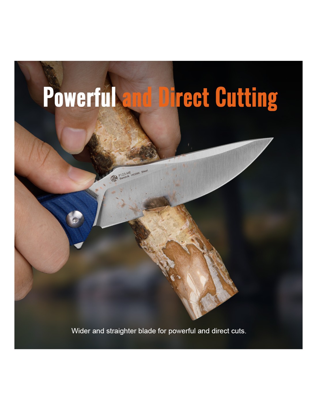 - Potente hoja con punta directa: La P123-ME incorpora una hoja de acero 14C28N más ancha y recta con una punta afilada y directa, optimizada para tareas de corte y perforación de gran resistencia.