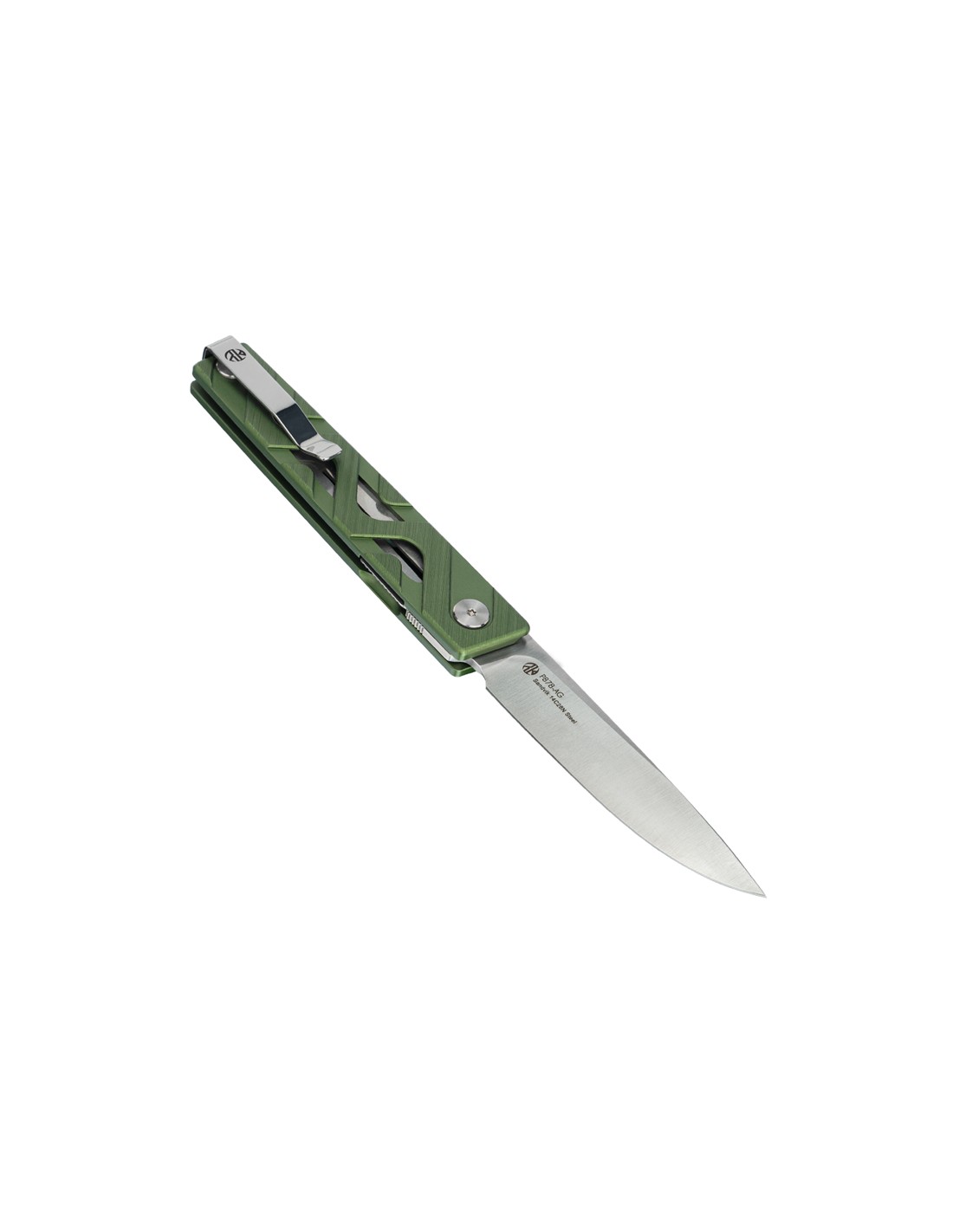 Su hoja de acero Sandvik 14C28N tipo Drop Point garantiza un corte eficiente, mientras que su mango de G10 en tono verde aporta un estilo distintivo y seguro al tacto. Pensada para ofrecer durabilidad, precisión y comodidad, la P878-AG incorpora un sistema de apertura suave con aleta y un doble sistema de bloqueo con seguro Beta Plus, que proporciona una capa adicional de seguridad al usuario.