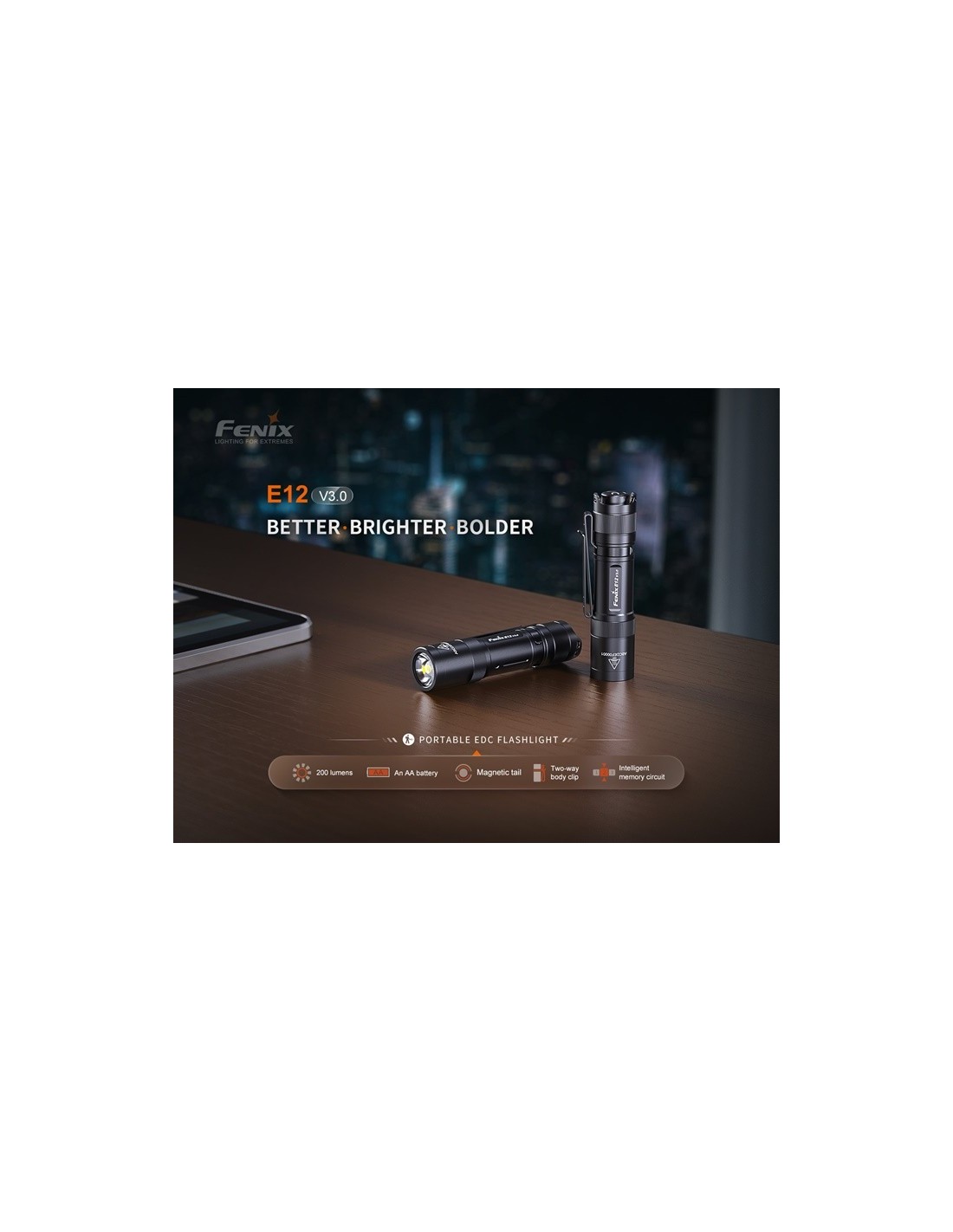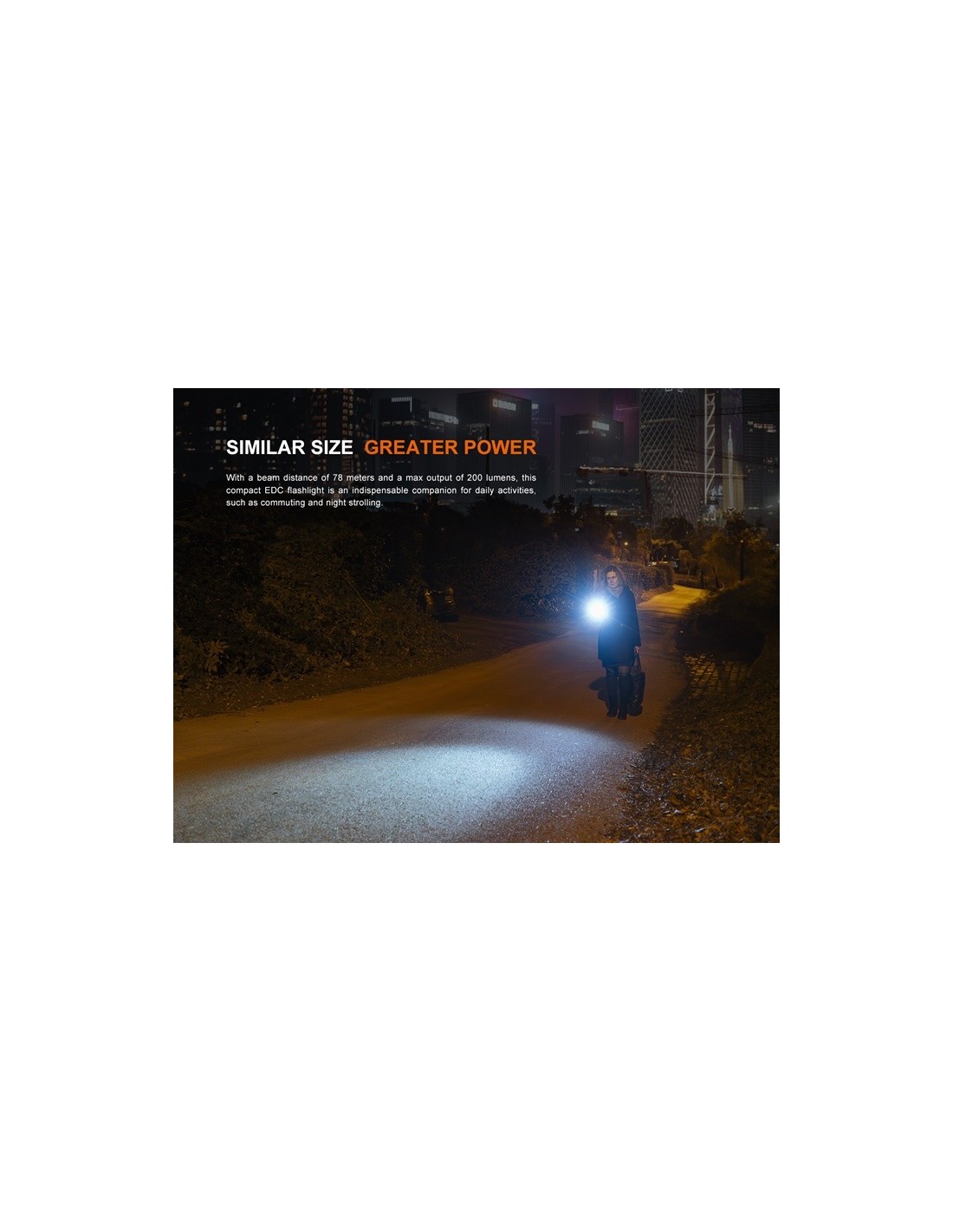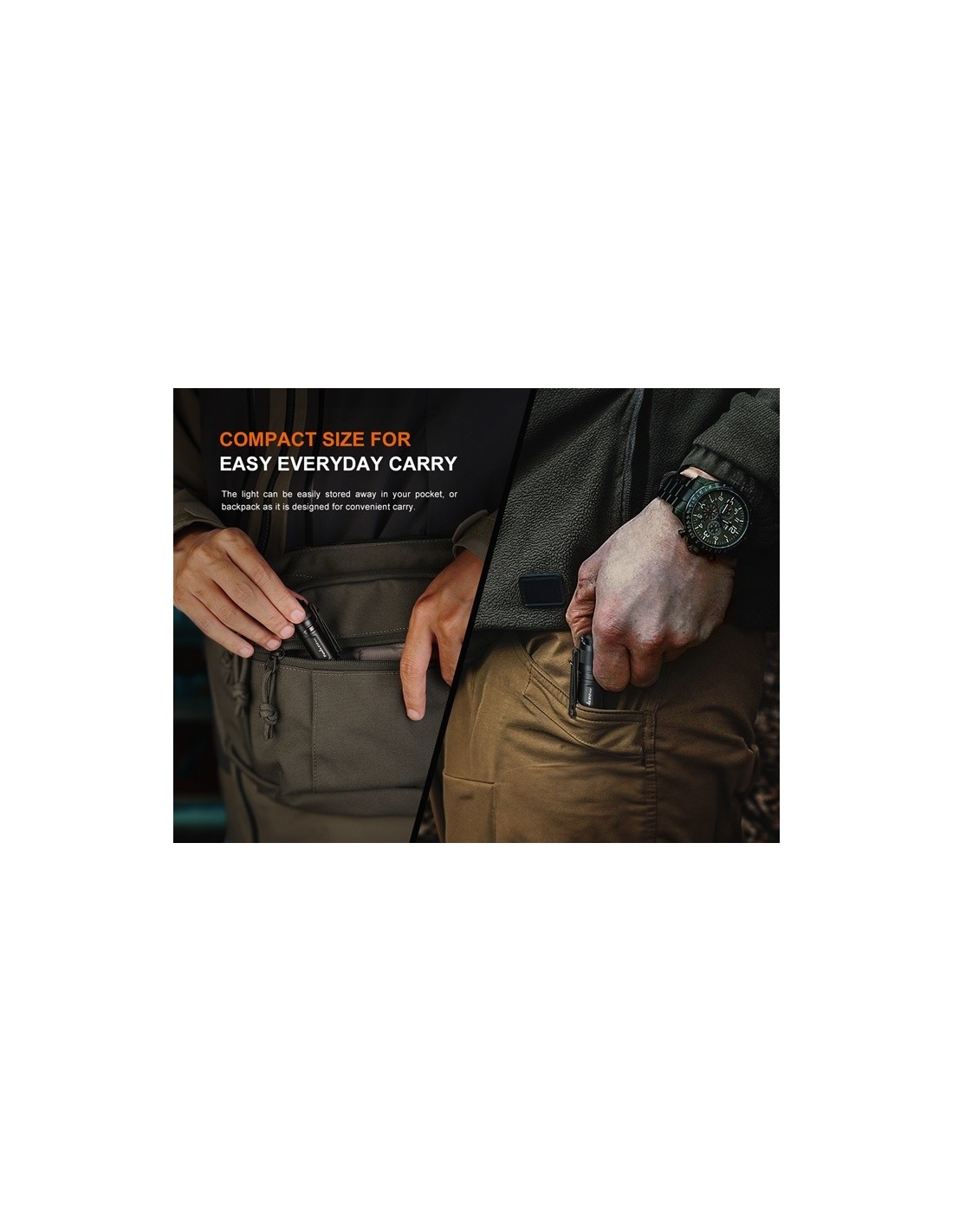 La nueva Fenix E12 V3.0 es una linterna EDC portátil y ligera, alimentada por una sola batería AA. La linterna tiene una potencia máxima de 200 lúmenes y puede lanzar un haz de luz de hasta 78 metros para satisfacer múltiples necesidades de iluminación. La energía de la batería no se consume en estado de espera, lo que proporciona energía suficiente para cada uso. El clip bidireccional para el cuerpo y la cola magnética permiten un uso cómodo y sin manos. Otras características destacadas son la posibilidad de colocar la cola de pie y la protección IP68. Tanto si estás en el trabajo como de viaje, Fenix E12 V3.0 siempre estará ahí para iluminar el camino.