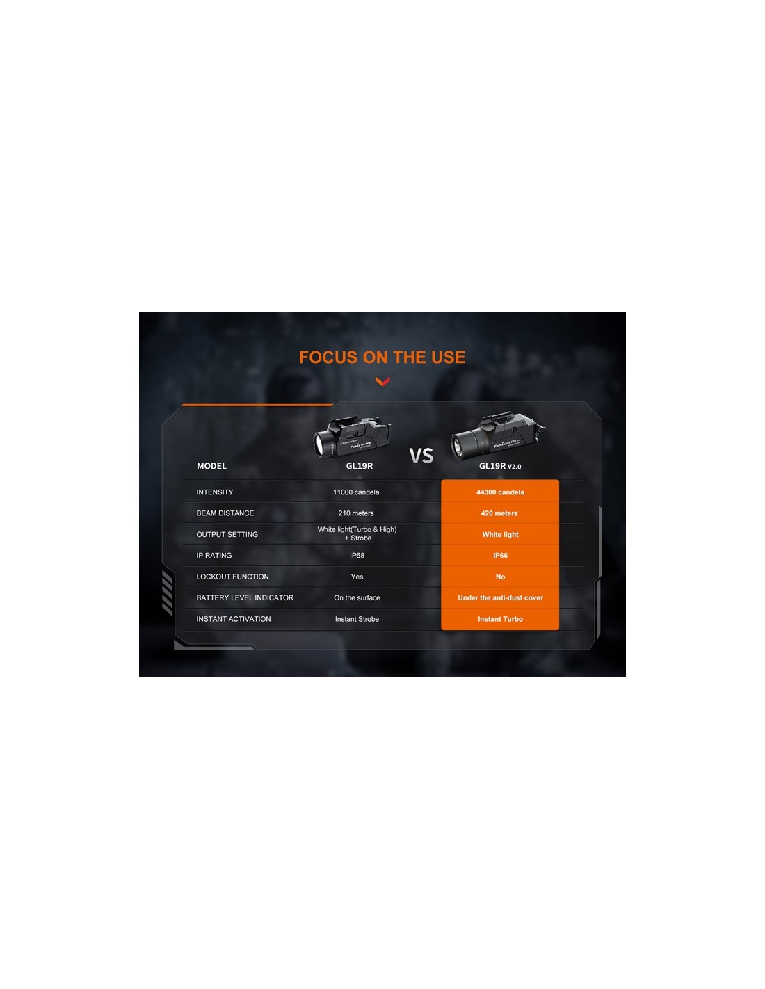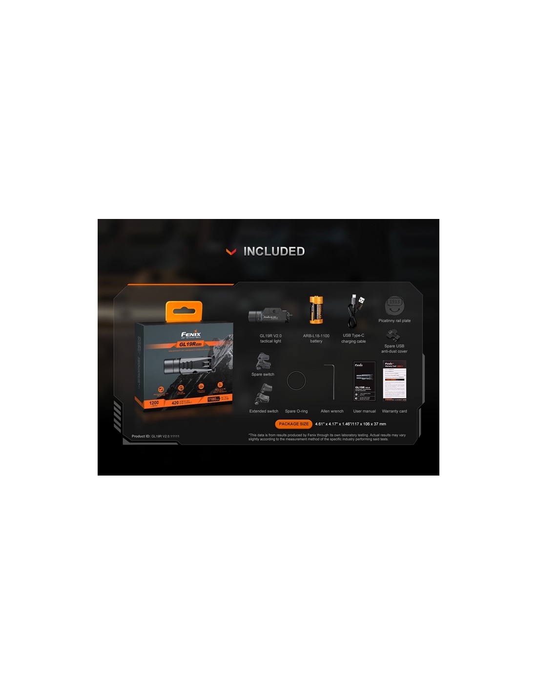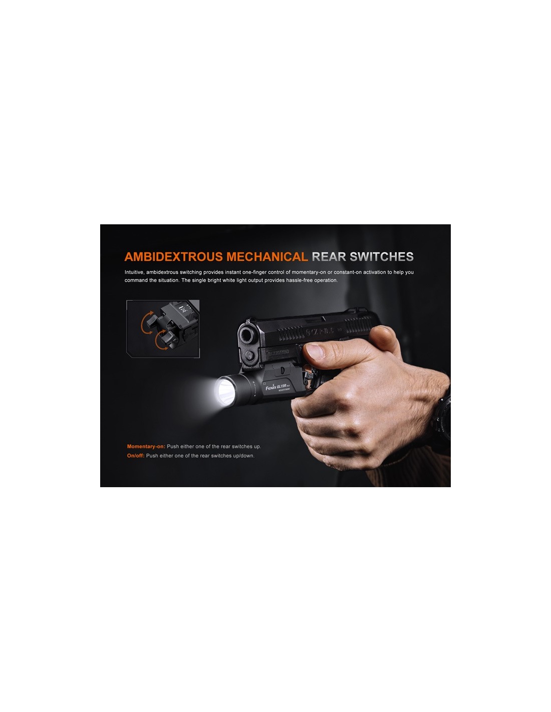 Diseñada para profesionales que realizan un uso intensivo, la nueva linterna táctica Fenix GL19R V2.0 para montar sobre armas, ofrece una asombrosa luz blanca de 44300 candelas de gran brillo, con una potencia de 1200 lúmenes, ofreciendo un haz de luz de hasta 240 metros con un punto de luz muy eficaz. Es ideal para realizar maniobras e identificar amenazas a distancia. Con un interruptor ambidiestro, es posible controlar sin esfuerzo la activación momentánea o constante, con un solo dedo. El modo estroboscópico se puede activar presionando prolongadamente con la luz encendida para mantener siempre el control de la situación.