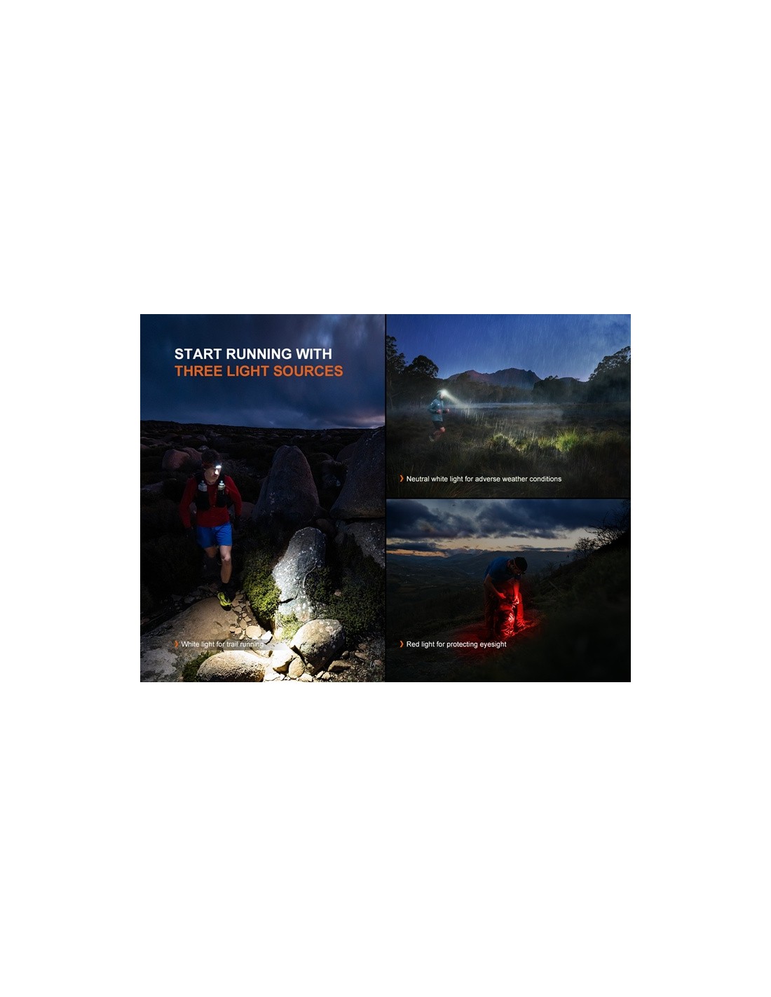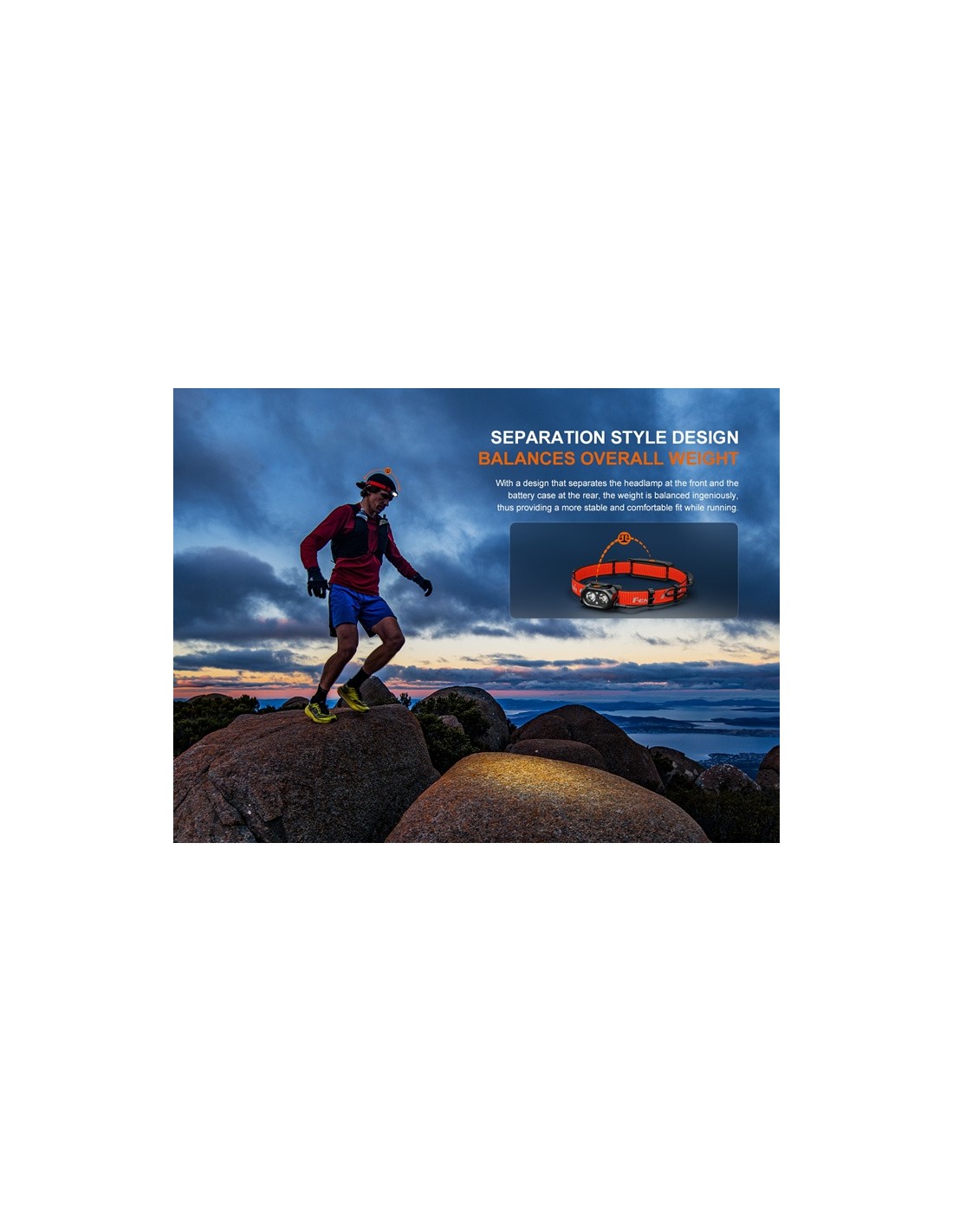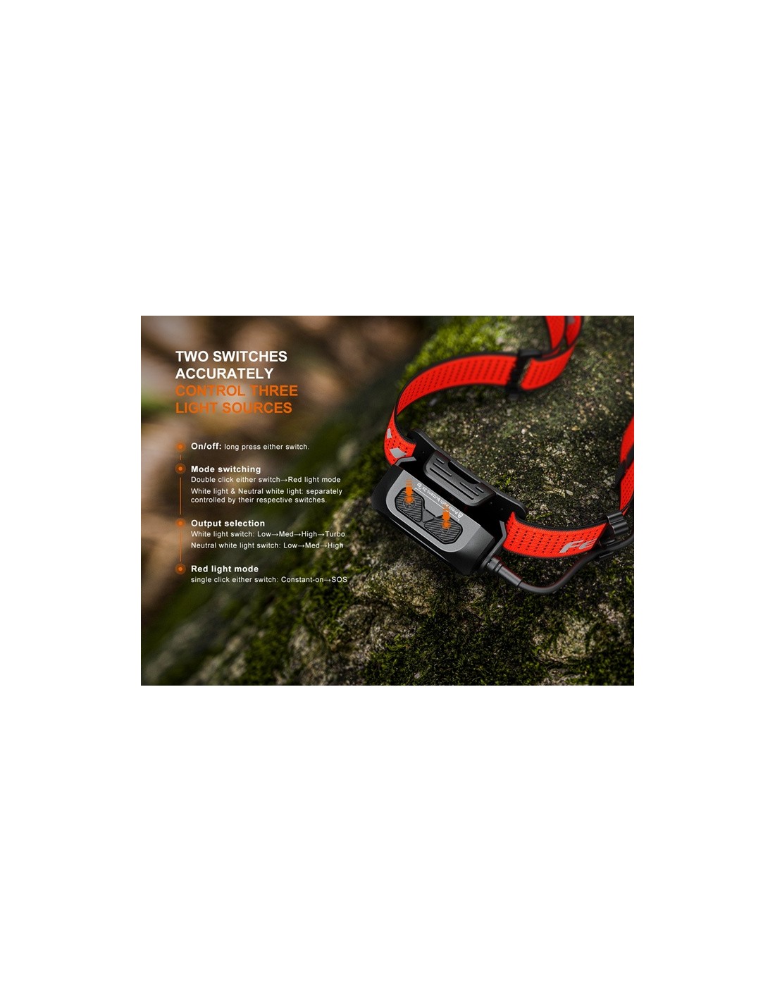 La nueva linterna frontal Fenix HP12R-T en color rojo, con diseño de separación está pensada para corredores de Trail Running que buscan un rendimiento superior y máxima comodidad. Con una potencia impresionante de hasta 1300 lúmenes y fuentes de luz blanca, blanca neutra y roja, es ideal para satisfacer diversas necesidades de iluminación en terrenos difíciles y condiciones climáticas adversas.