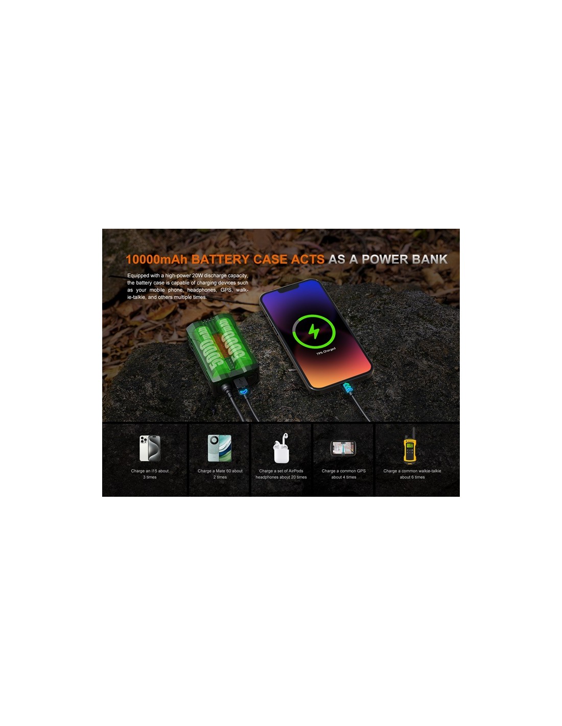 La carcasa de la batería de la Fenix HP35R puede cargar otros dispositivos a través de su puerto Tipo-C, que admite los protocolos de descarga rápida PD3.0/2.0. Su potencia máxima de descarga es de 20 mAh. Su potencia máxima de descarga es de 20 W. El frontal puede funcionar mientras se descarga.
