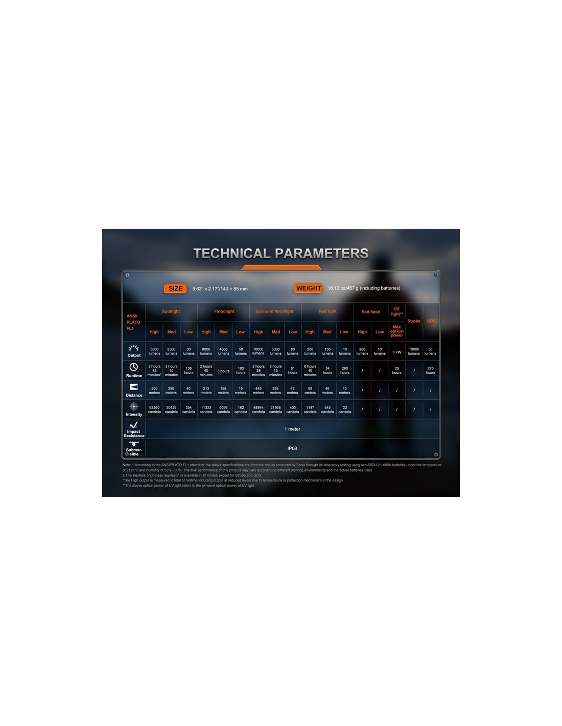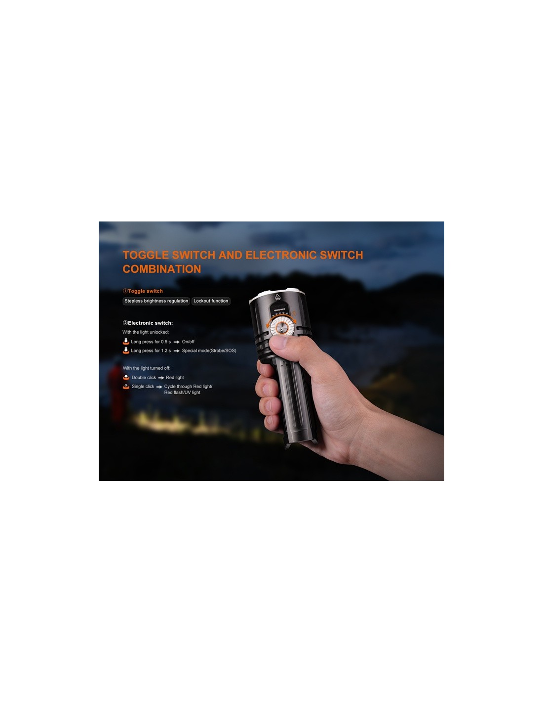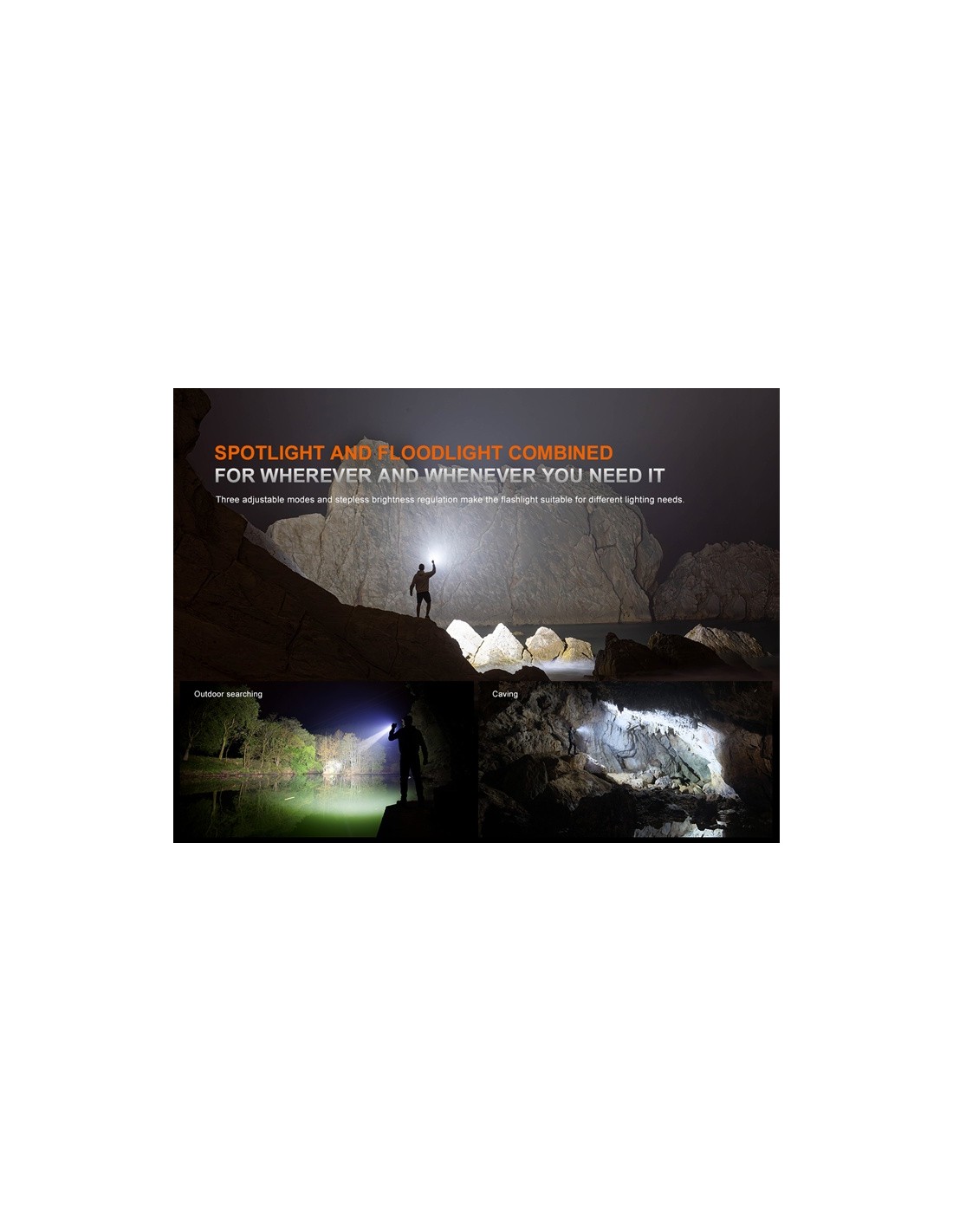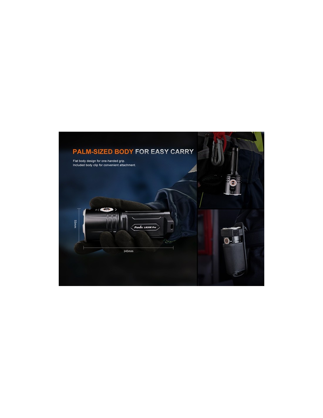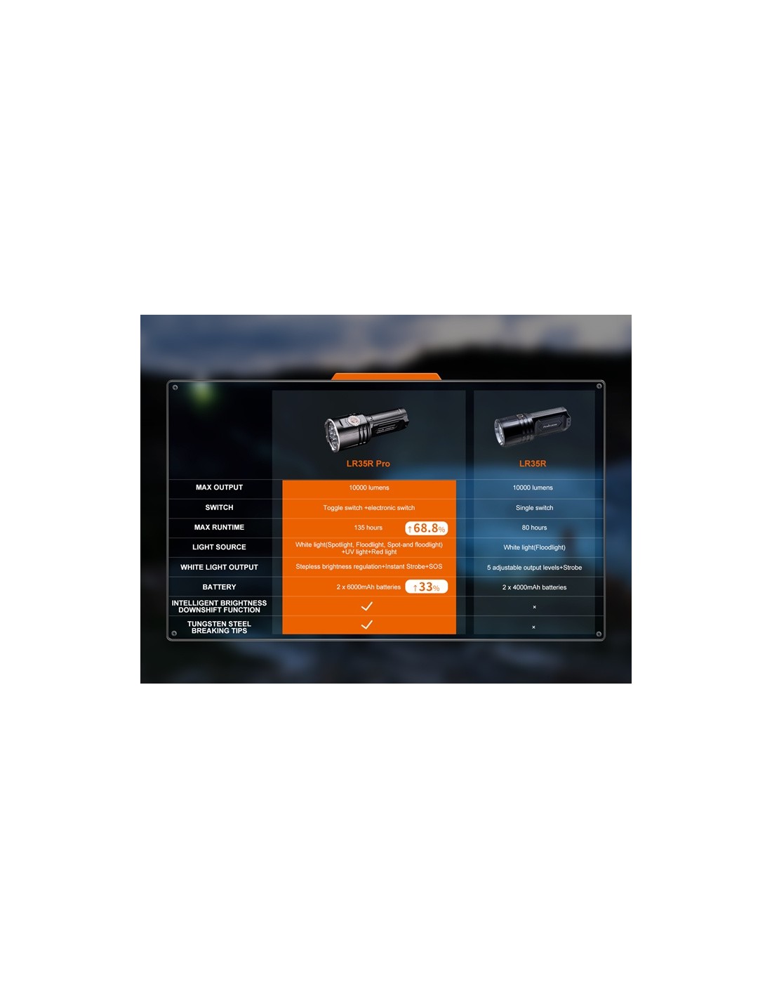 La Fenix LR35R Pro es una linterna de alto rendimiento creada para misiones profesionales y actividades al aire libre exigentes. Con una potencia máxima de 10 000 lúmenes y un alcance de haz de hasta 500 m, combina funcionalidad de foco y luz de inundación en un cuerpo compacto, controlado mediante un intuitivo selector rotativo. Además, incorpora modos de luz roja e infrarroja UV, perfectos para señalización, lectura nocturna o detección de autenticidad, con una estructura robusta que garantiza resistencia y confiabilidad en entornos exigentes.