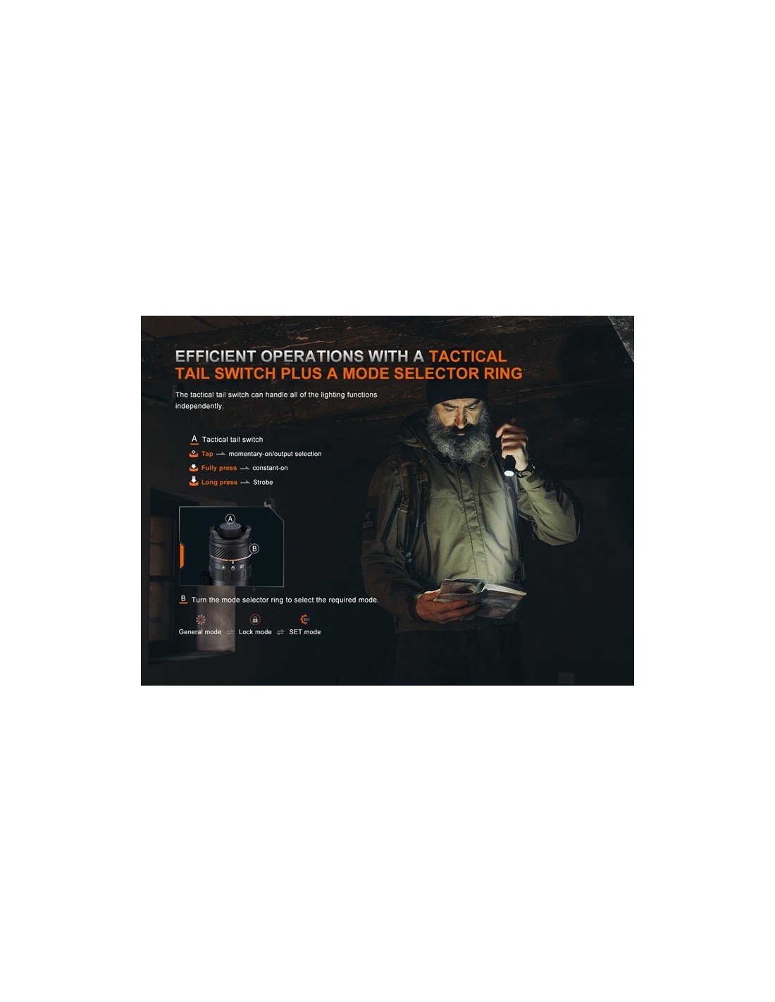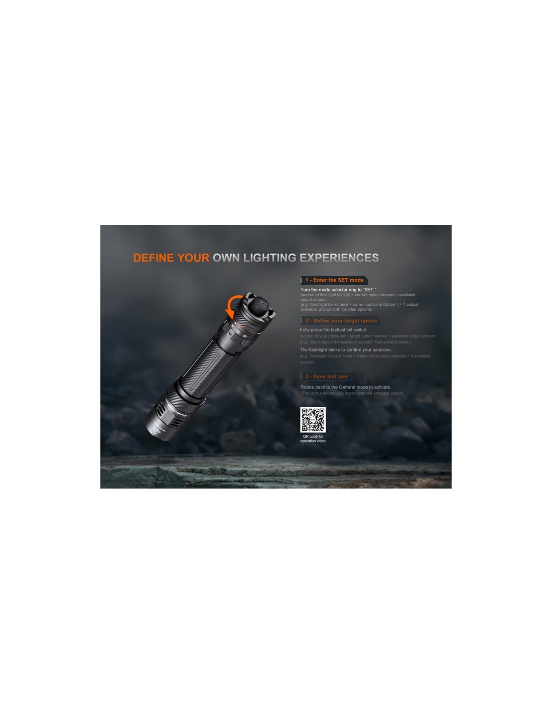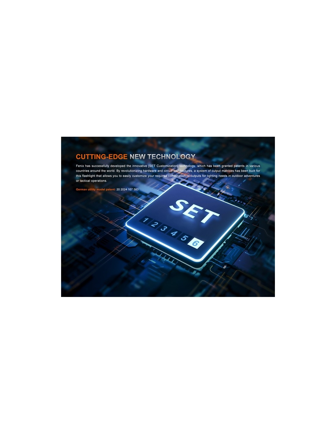 Su innovador diseño del modo SET permite cambiar fácil y rápidamente entre varios modos de iluminación en función de los diferentes escenarios de aplicación y las preferencias personales. Las operaciones de selección de salida, función de bloqueo, cambio de modo y definición del modo son sencillas y precisas. Todas estas características hacen que la linterna sea capaz de satisfacer diversas demandas de iluminación tanto en actividades al aire libre como en operaciones tácticas.