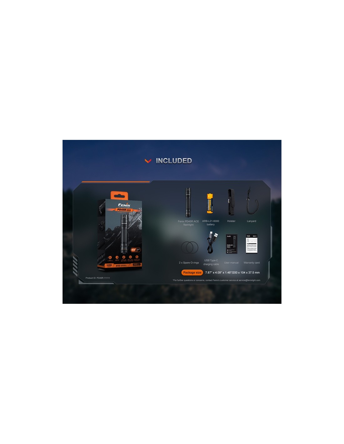 La caja de la linterna PD45R ACE viene con una batería Fenix ARB-L21-6000. Se recomienda utilizar una batería Fenix de la serie ARB-L21. No se recomienda otras baterías de iones de litio, ya que una batería no compatible puede hacer que la linterna no funcione con normalidad.