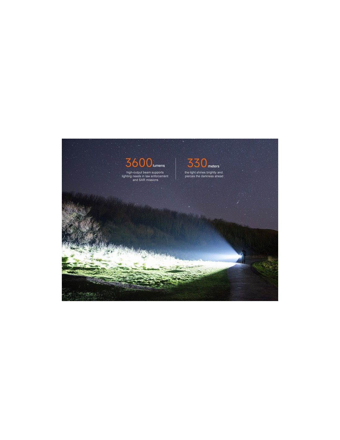 Salida máxima de 3600 lúmenes, alcance máximo de 330 metros.