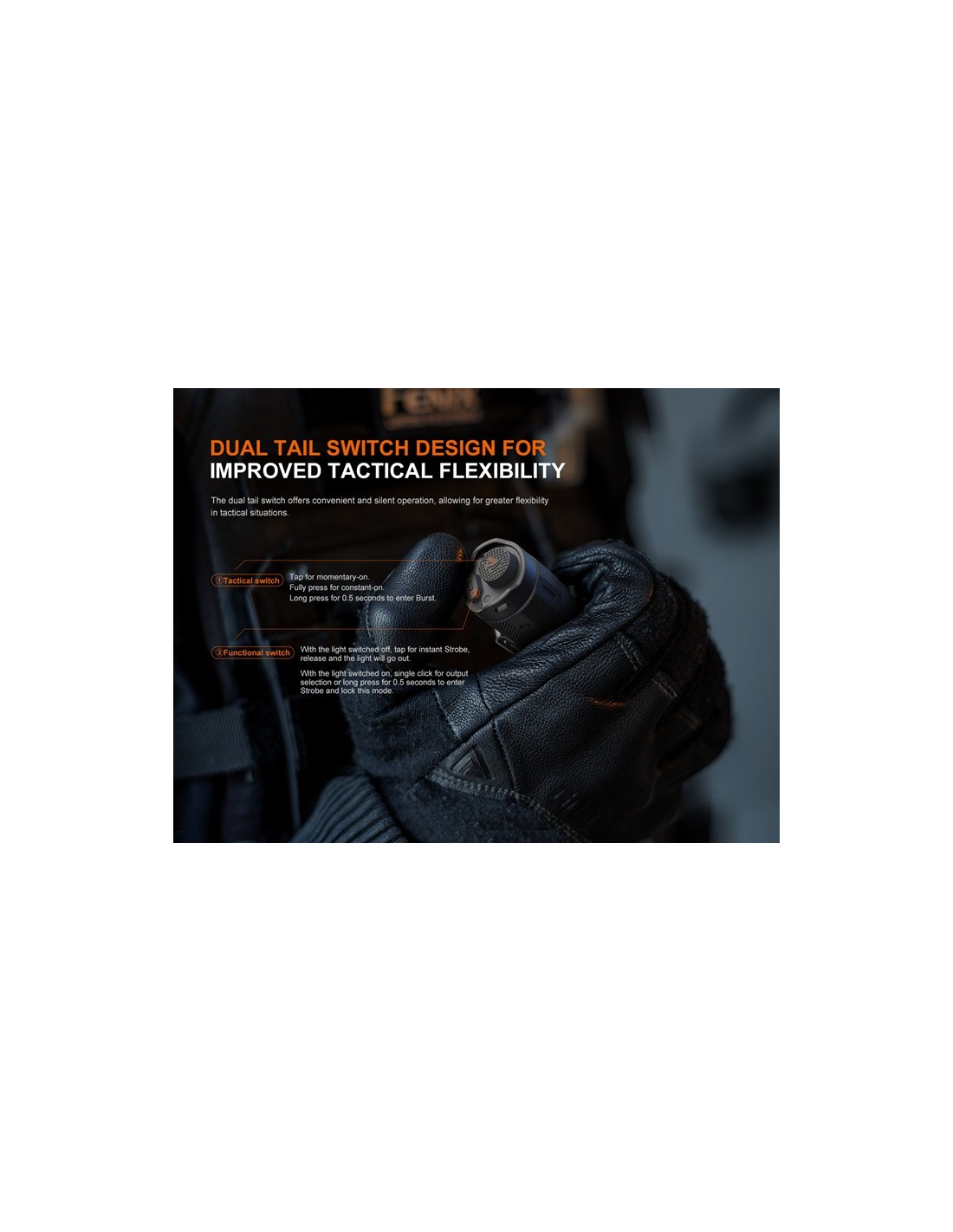 - Interruptor de cola táctico dual para ráfaga instantánea y estrobo instantáneo.